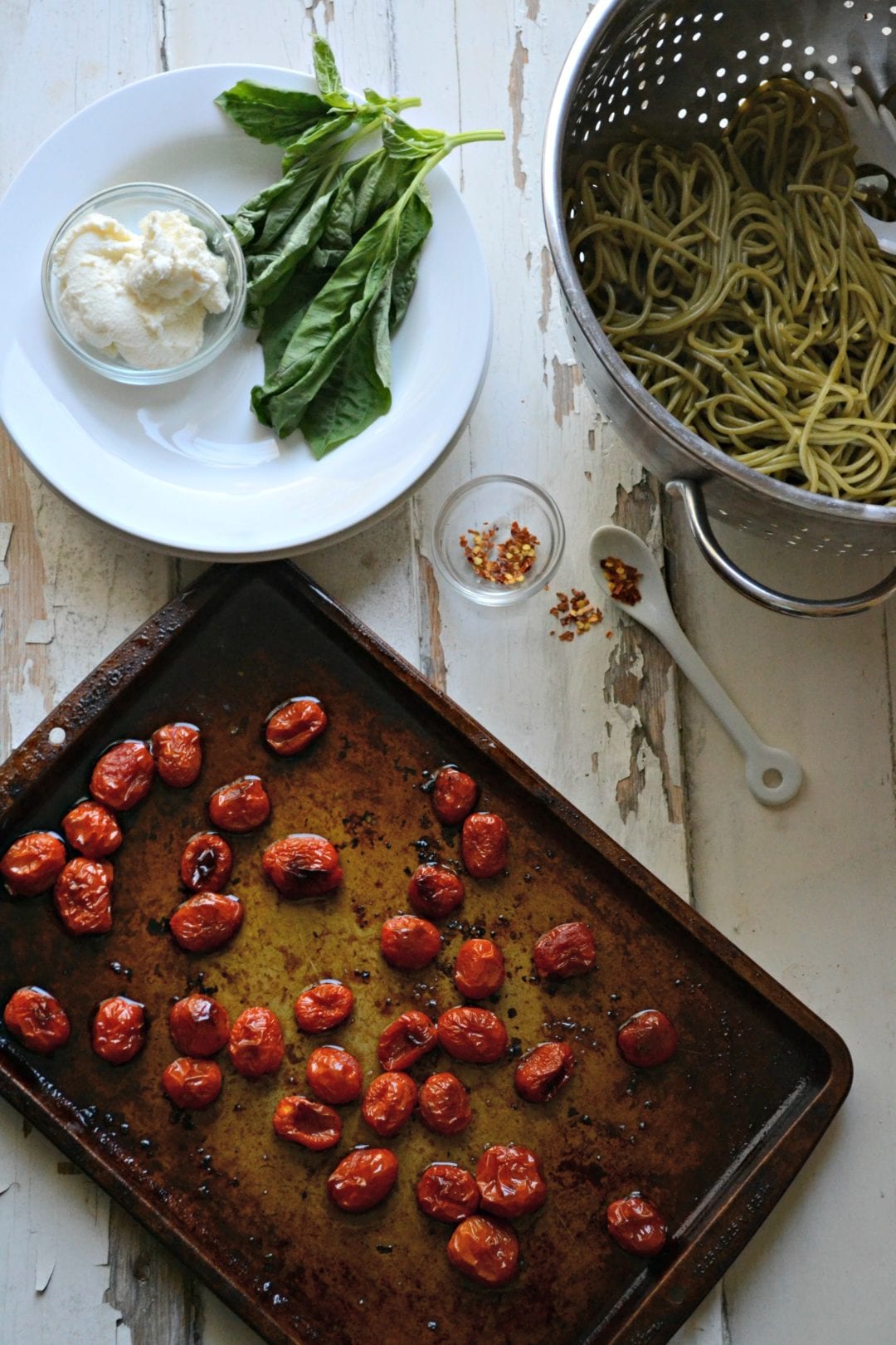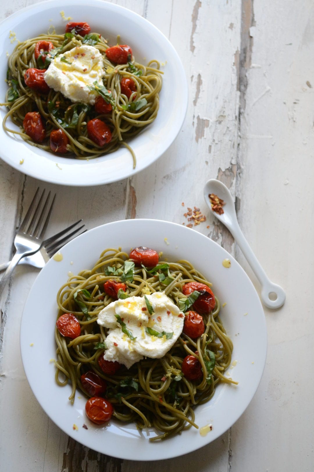 In a large bowl, toss the spaghetti together with the tomatoes, lemon zest, and lemon juice, and the oil they were cooked in. Break a few tomatoes for extra flavor in the sauce. Portion out two large or four small servings of pasta and top each with a dollop of ricotta, crushed red pepper flakes, and basil.