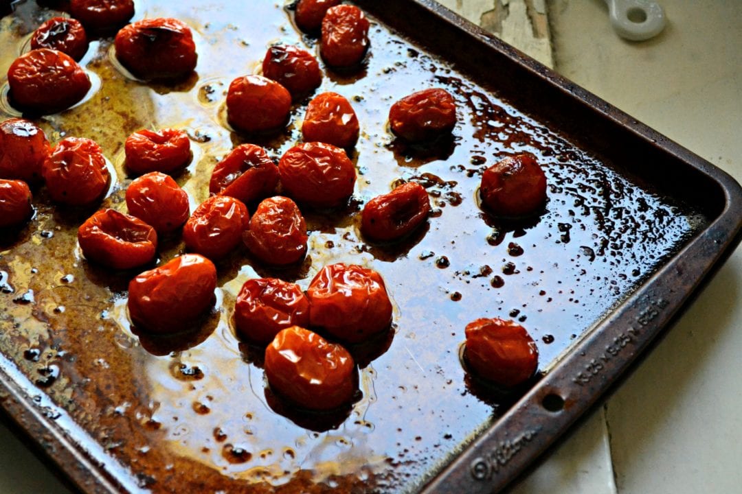 Preheat your broiler to low. Place tomatoes on a baking sheet, coat in olive oil, and season with salt and pepper. Place tomatoes on the middle rack, not too close to the broiler. Broil for ten minutes. Flip tomatoes and then broil for ten more minutes.