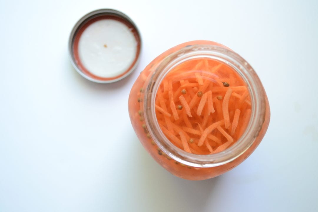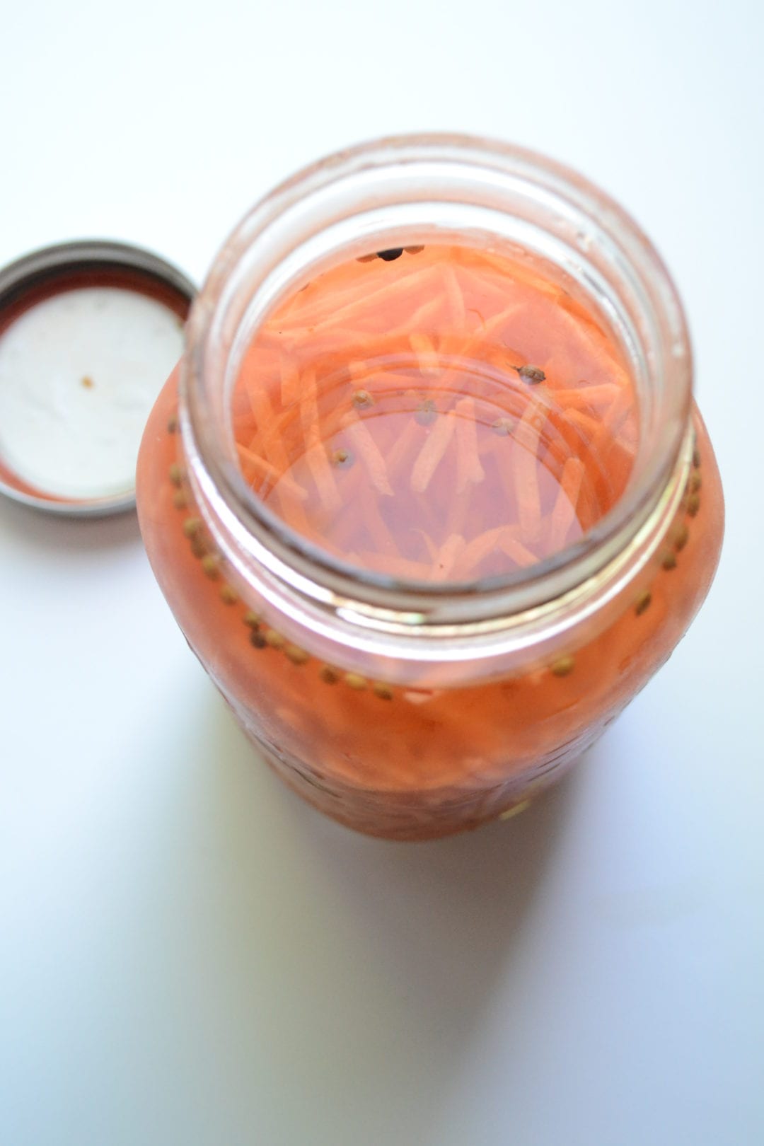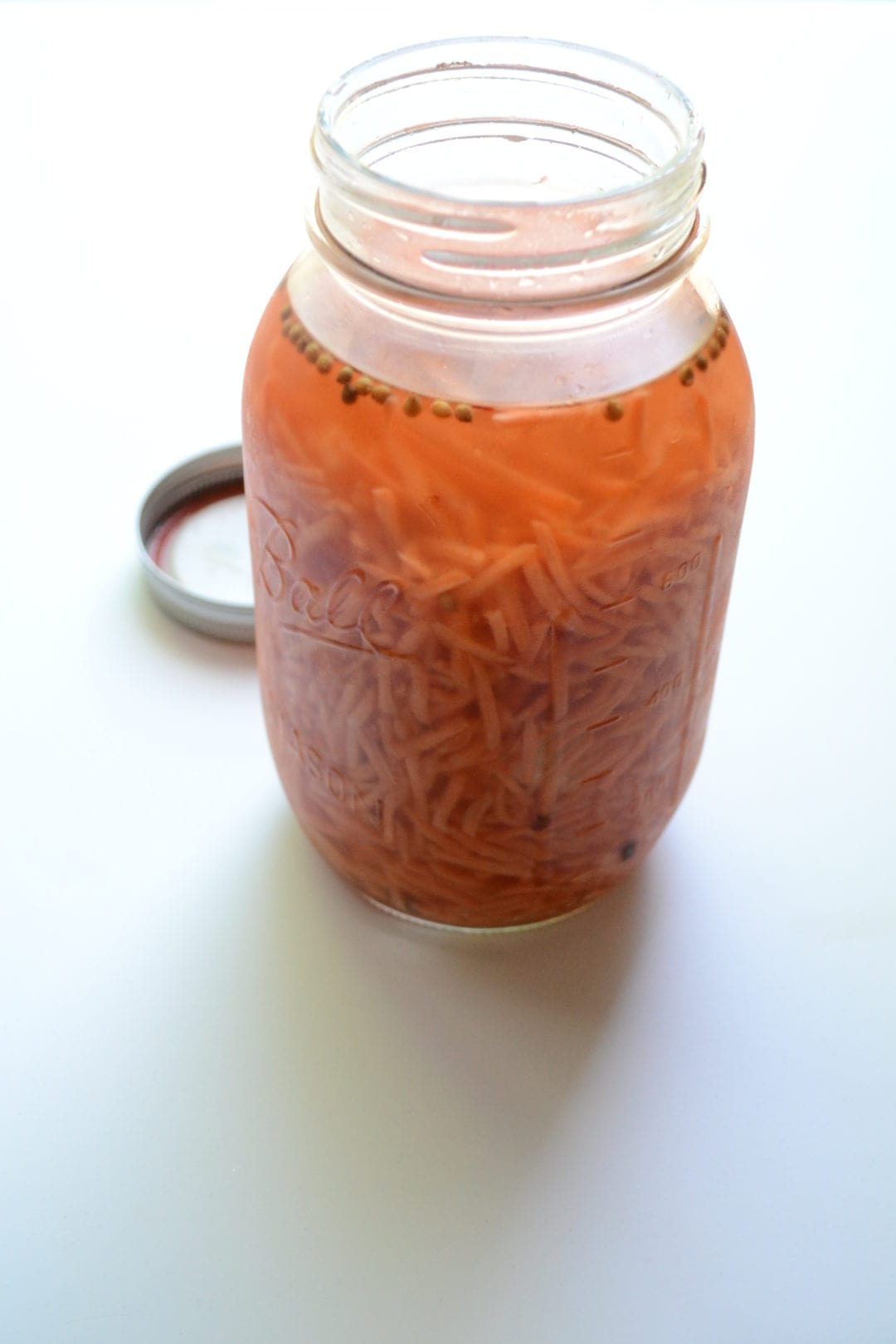 Carefully transfer carrots, using tongs, to a large mason jar or two smaller mason jars. Pour liquid over carrots. Chill completely before placing lid on. Allow 24 hours before eating.
