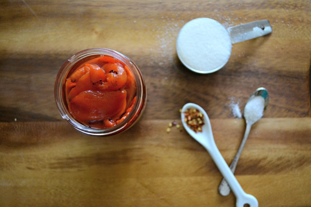 Add the roasted red peppers and liquid to a small saucepan. Bring to a simmer over medium heat. Mix in the sugar, salt, and crushed red pepper. Reduce heat to low and simmer for ten minutes.
