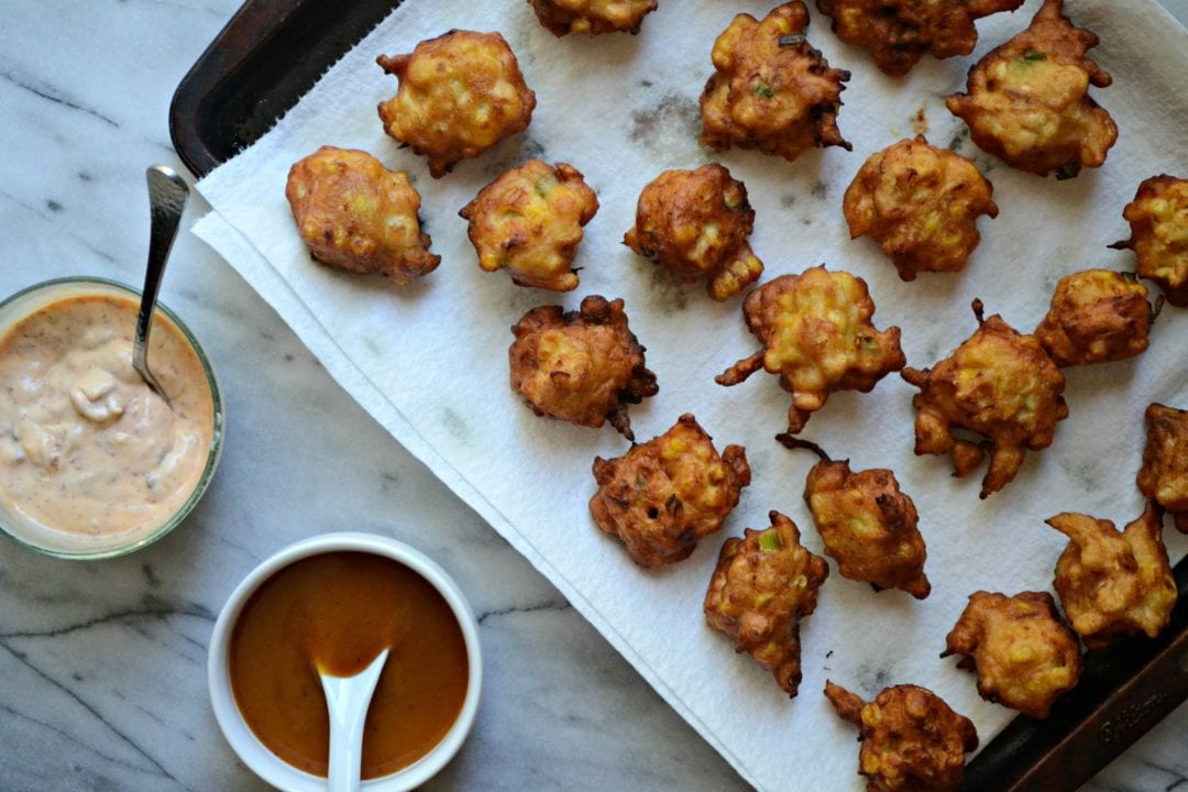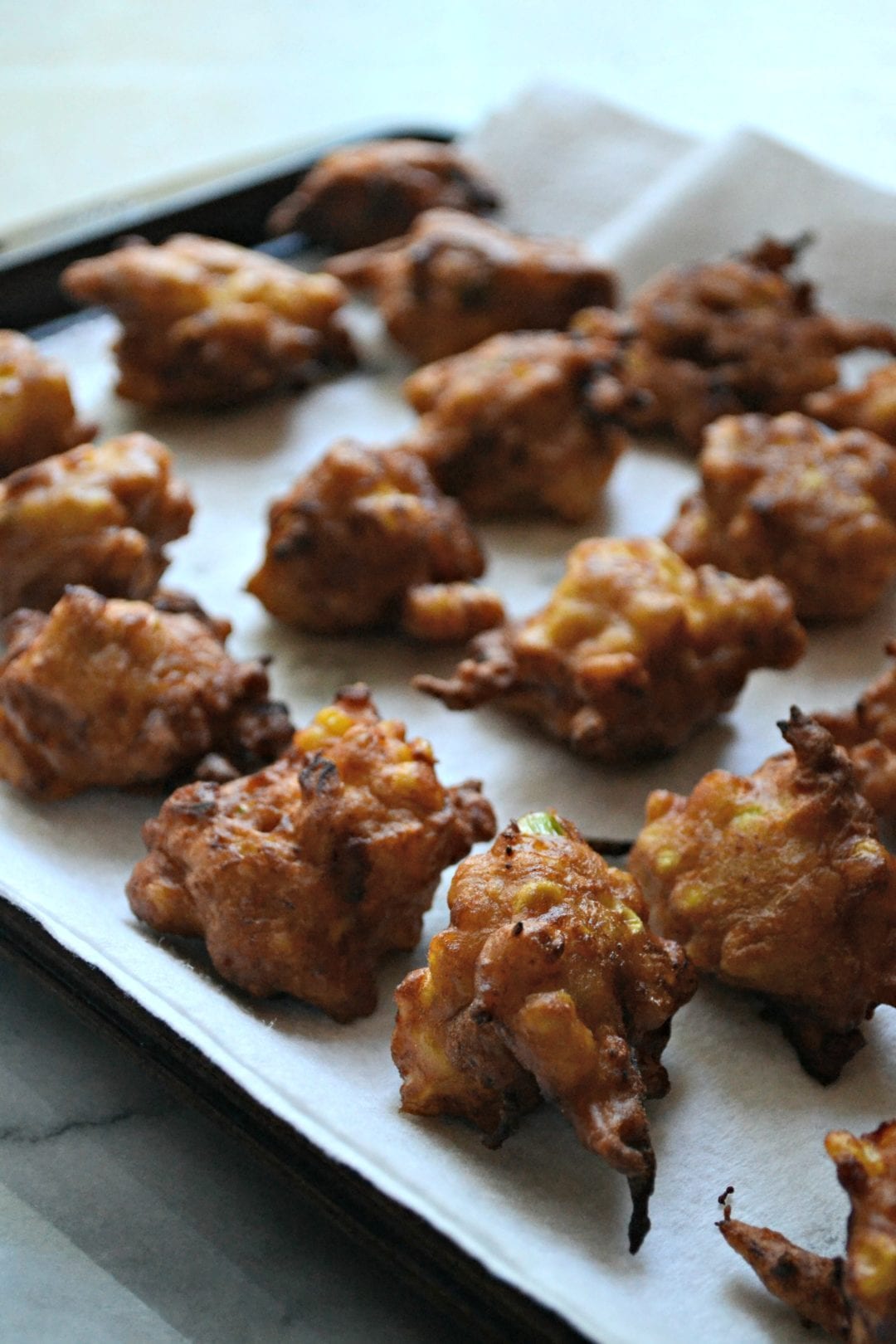Once the oil is hot, use a small ice cream scoop or teaspoon to add the batter to the oil. Fry for about two minutes on each side, until they are lightly golden. Be sure to monitor the oil temperature as you go. Use a slotted spoon to remove the fritters and add them to a baking sheet lined with a paper towel to cool and drain.
