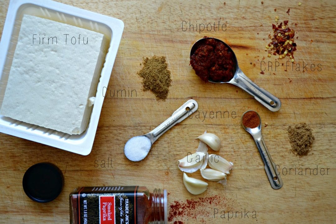 Alright, let’s get right to this suuuuuuper easy recipe. I am not kidding that all you need are the dry seasonings already in your pantry/ lazy susan and maybe some tofu and maybe some canned chipotle peppers. Make it happen, people! It is a healthy way to add more protein to your diet while keeping the same spicy flavors you love from a reggy fatty old chorizo.