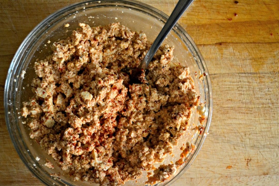Meanwhile, add tofu, chipotle peppers, salt, pepper, cumin, coriander, paprika, and cayenne to a small mixing bowl. Use a fork to mix and mash all the tofu and seasonings together.