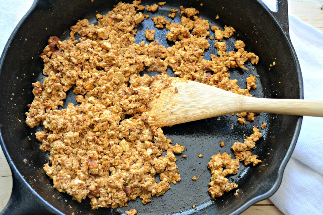 If you are not going to eat the soyrizo right away, add the heated and seasoned oil to the tofu mixture, mix to combine, and then store in an airtight container in the freezer until ready to serve. If you are ready to eat the soyrizo, add the tofu mixture to the hot seasoned oil and sauté for 15 minutes stirring occasionally until slightly crisp.