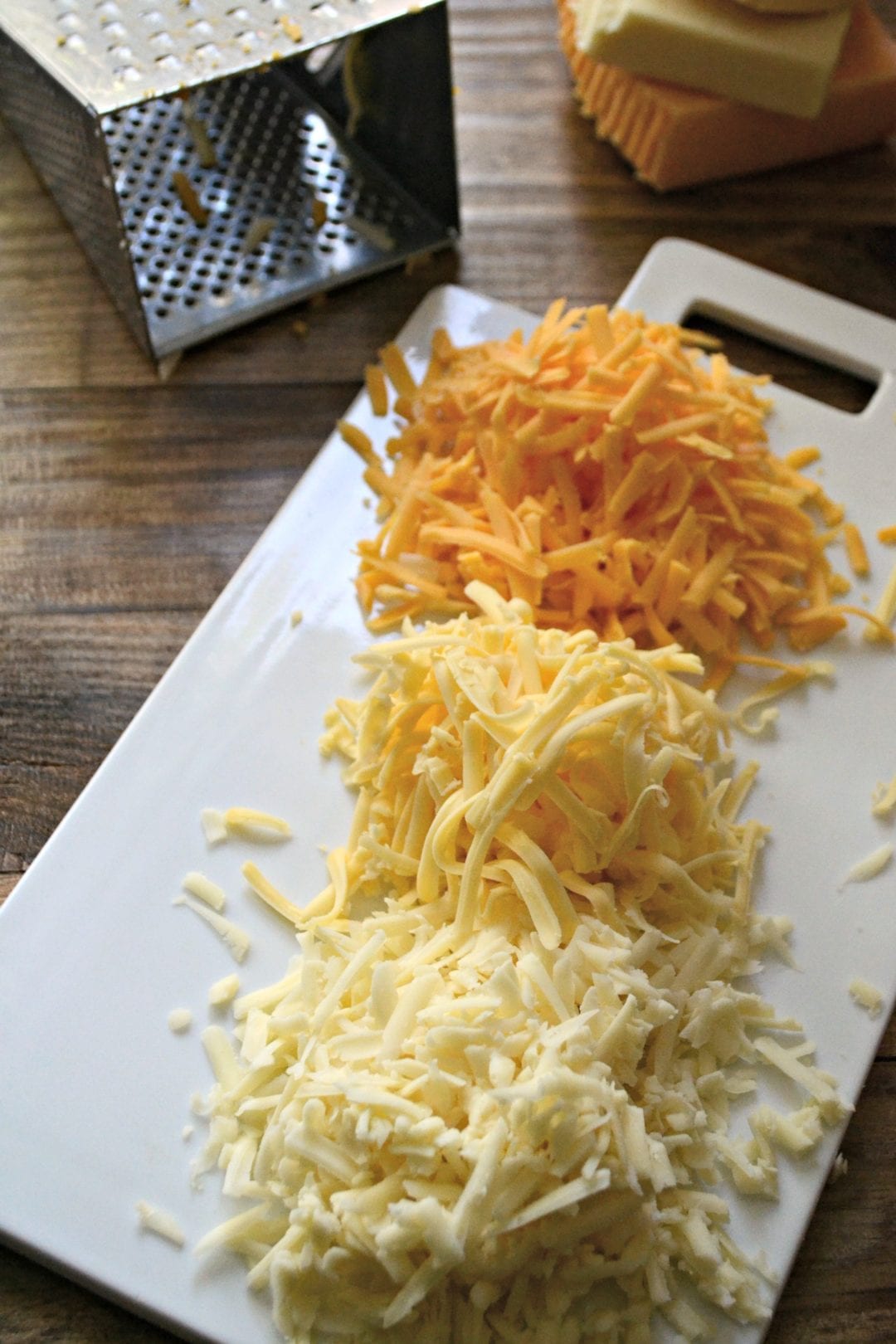 For the cheese sauce, heat the butter in a saucepan over medium heat. Once it is melted, add the garlic and cook for 15 seconds, then whisk in the flour to create a roux. Stir the roux until it is golden in color, 1 to 2 minutes. Pour the milk in slowly and whisk constantly until the liquid starts to thicken, another 5 minutes. Reduce the heat to low and add the mascarpone, Gruyere, 6 ounces of the cheddar, 6 ounces of the Fontina and the Parmesan cheese. Stir the sauce constantly with a heatproof spatula until the cheese is melted, then add the pepper, salt, and nutmeg. Stir to combine.