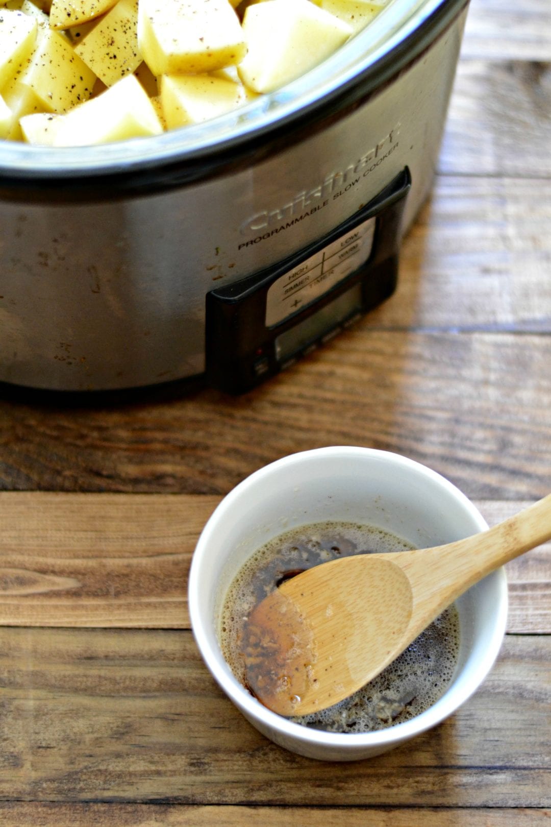 Add butter to a small saucepan. Heat over medium/low heat until the butter starts to crackle. Once the butter quiets down and the foam clears, stir the butter occasionally until it starts to turn a warm brown color and begins to smell nutty. Once you can see the little brown bits, shut the flame, and take the pan off the heat right away. Transfer the brown butter to a small bowl to cool slightly. To save time and space, this step can be done the day/night before. The butter will melt when it cooks along with the potatoes in the slow cooker.