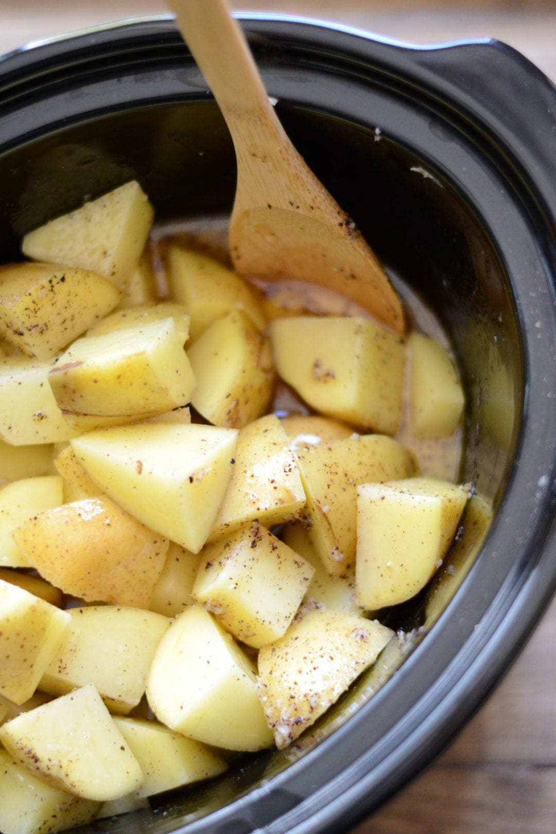 Peel and roughly chop the potatoes into large chunks. Add the brown butter, garlic, salt, pepper, stock, and milk to the slow cooker. Stir to combine. Add in the potatoes and make sure the potatoes are mostly covered with the liquid.