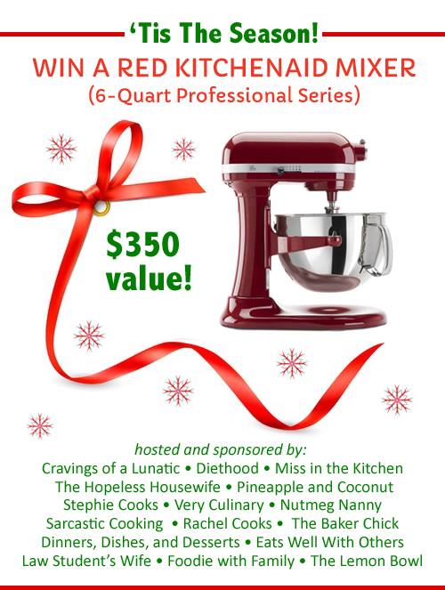 ‘Tis the season, right? A group of us food bloggers got together and decided to give away one beautiful, shiny, new stand mixer to one of our loyal and soon to be very lucky readers. I am actually kind of jealous because this mixer is nicer than the one taking up space in my kitchen.