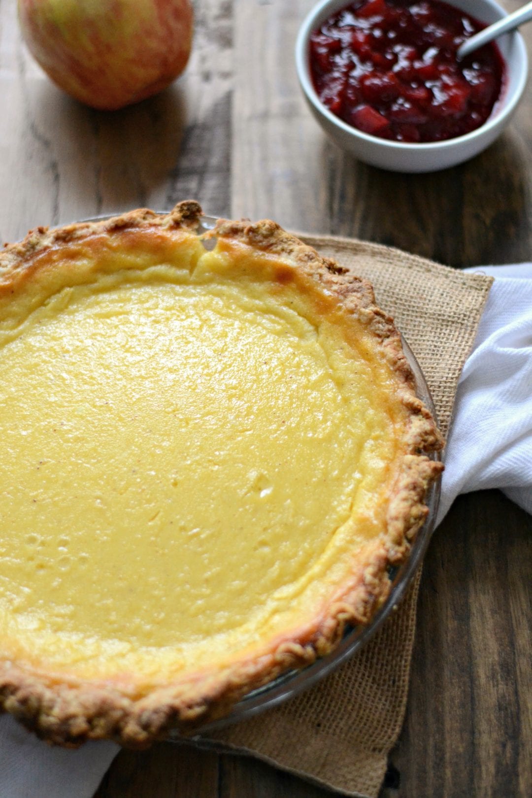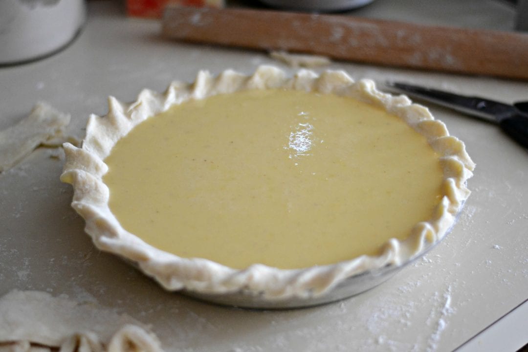 Remove the crust from the refrigerator and remove the plastic wrap. Roll out on a lightly floured surface until the dough is about a 10 inch circle. Trim the edges to make it more of a perfect circle. Butter a 9 inch pie dish, place the dough inside the dish, press into the bottom and then crimp the edges between two of your fingers. Pour the filling into the crust and then bake for 55-60 minutes until no longer jiggly in the center.