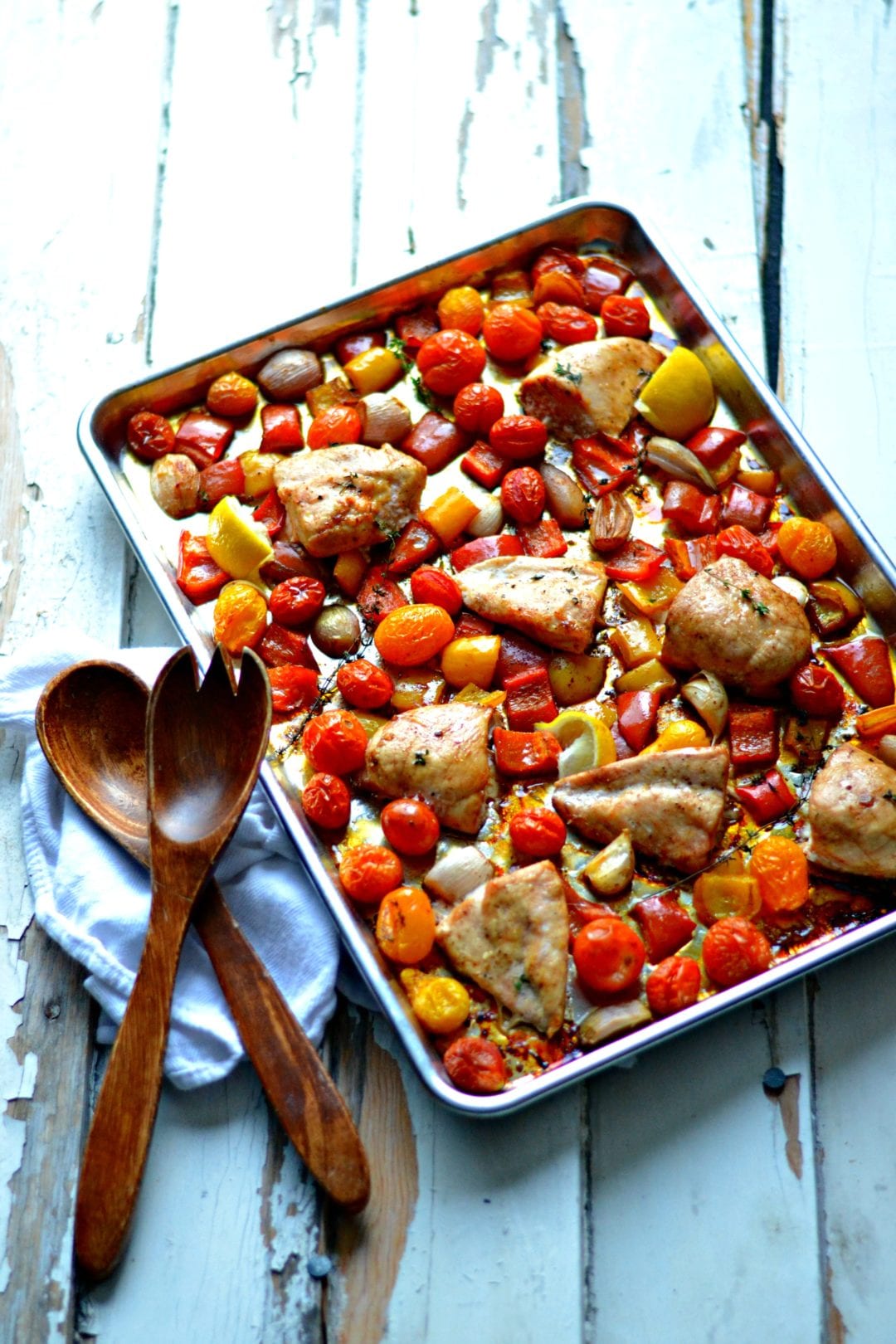 Tray-Baked Balsamic Chicken with Peppers, Tomatoes, and Onions