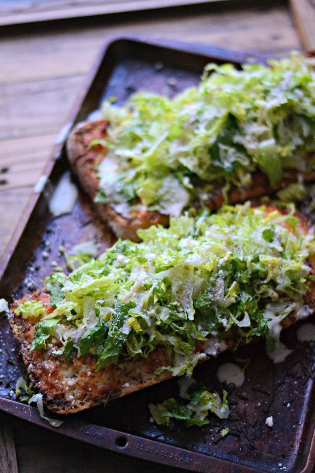 If you are serving the bread right away, toss the dressing and romaine together in a bowl and then top each half with salad. Cut, sprinkle some more grated parmesan on top, and then serve.