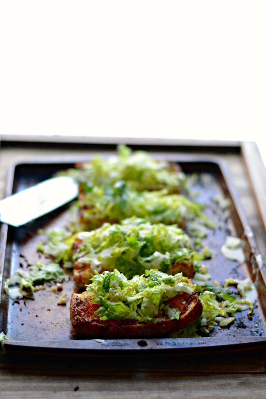 And that is why I have brought you an easy, cheesy garlic bread topped with Caesar salad! This is the perfect Valentine’s Day appetizer. It would be a nice preface to a shared plate of spaghetti and a meatball rolled across the table by your significant other using only their nose. I don’t care what you guys say; Lady and the Tramp is pretty romantic, even if it is about a few dogs.