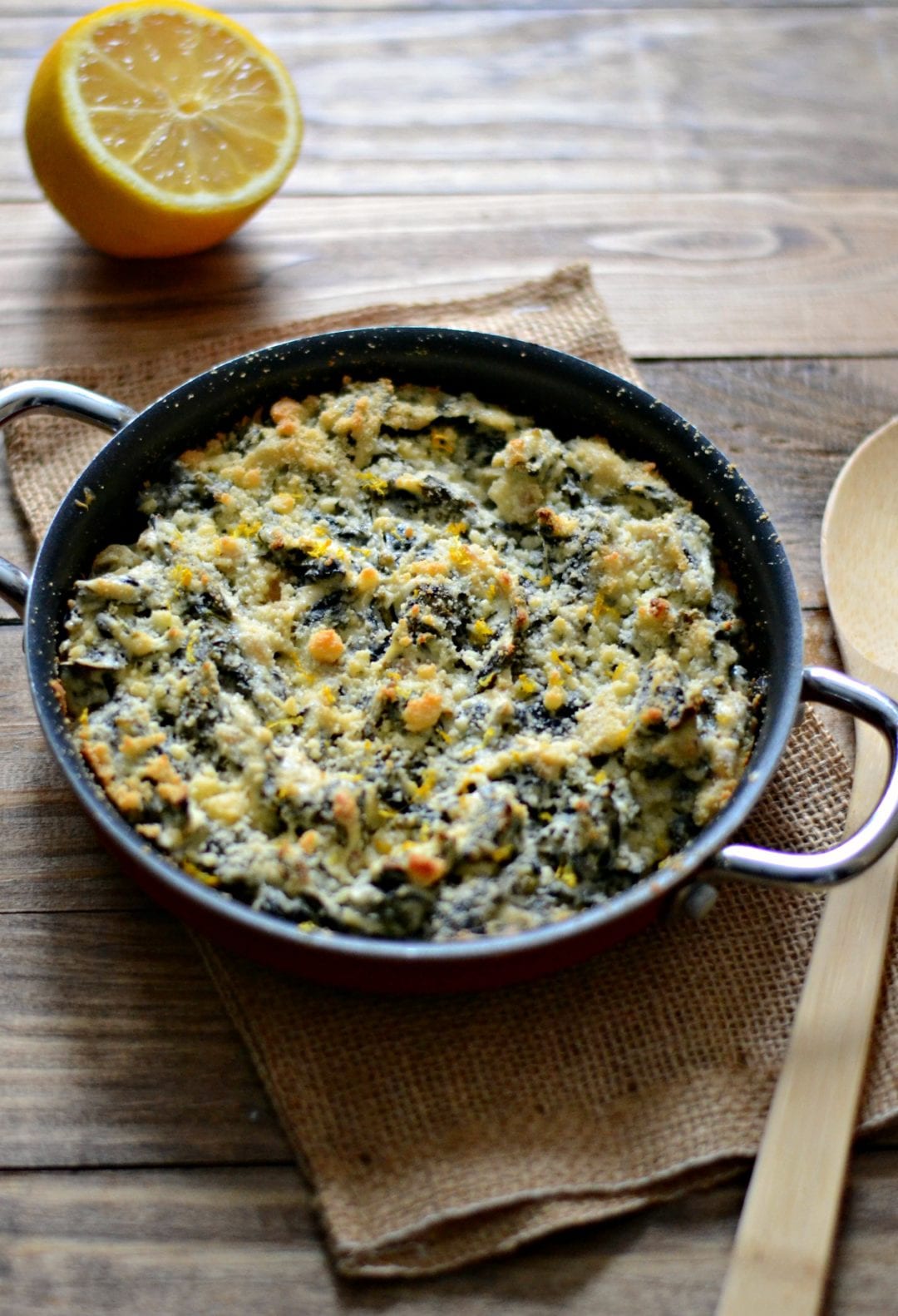 Once all the cream cheese has melted, mix in ½ cup of grated parmesan. Turn off the heat. Transfer kale to a small baking dish (6 inch round or a 3 cup rectangular Pyrex dish). Top with remaining parmesan and lemon zest. Drizzle lightly with olive oil. Bake for 10-15 minutes until golden.