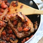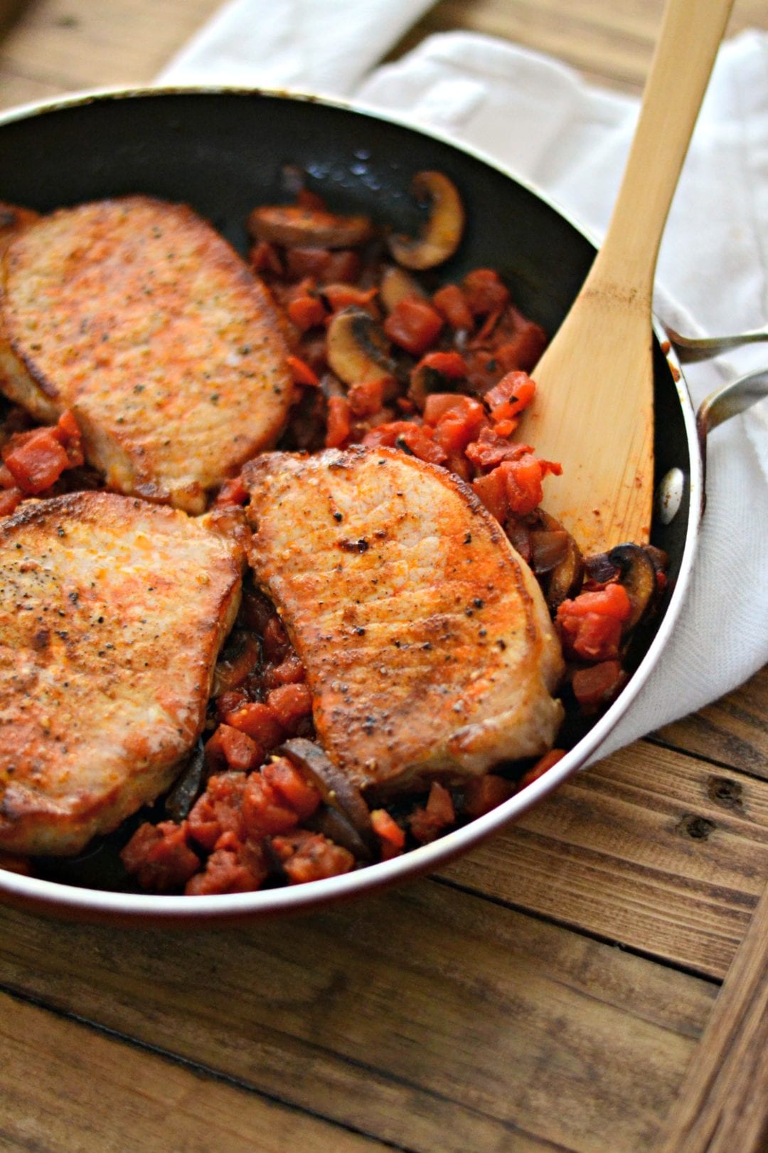 Mix in the drained tomatoes. Add a little more salt and pepper to taste. Nest the pork chops back into the pan and cover with the lid. Cook for 4 more minutes. The internal temperature of the chops should be around 140 degrees when they are fully cooked.