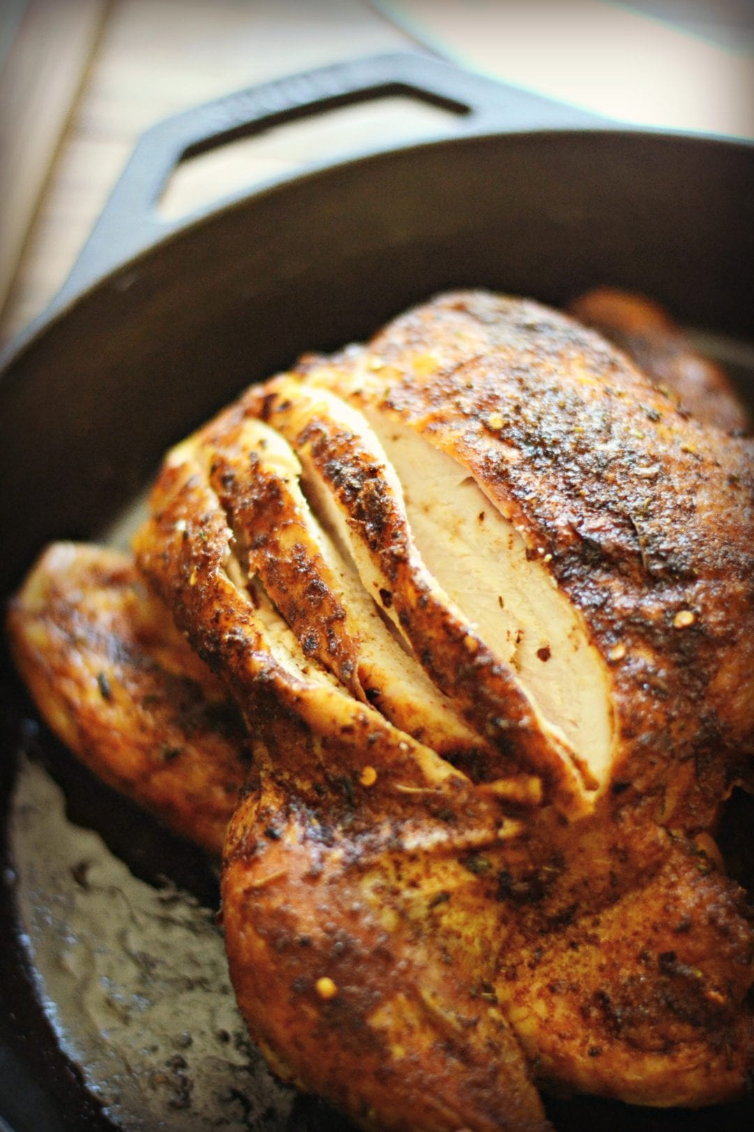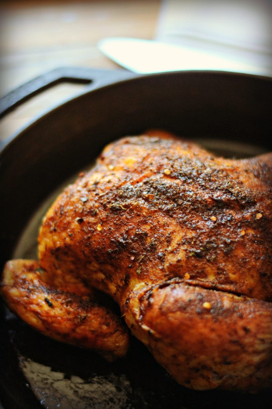 At this time, place the whole chicken, breast side up, into the crock pot or into a cast iron skillet.