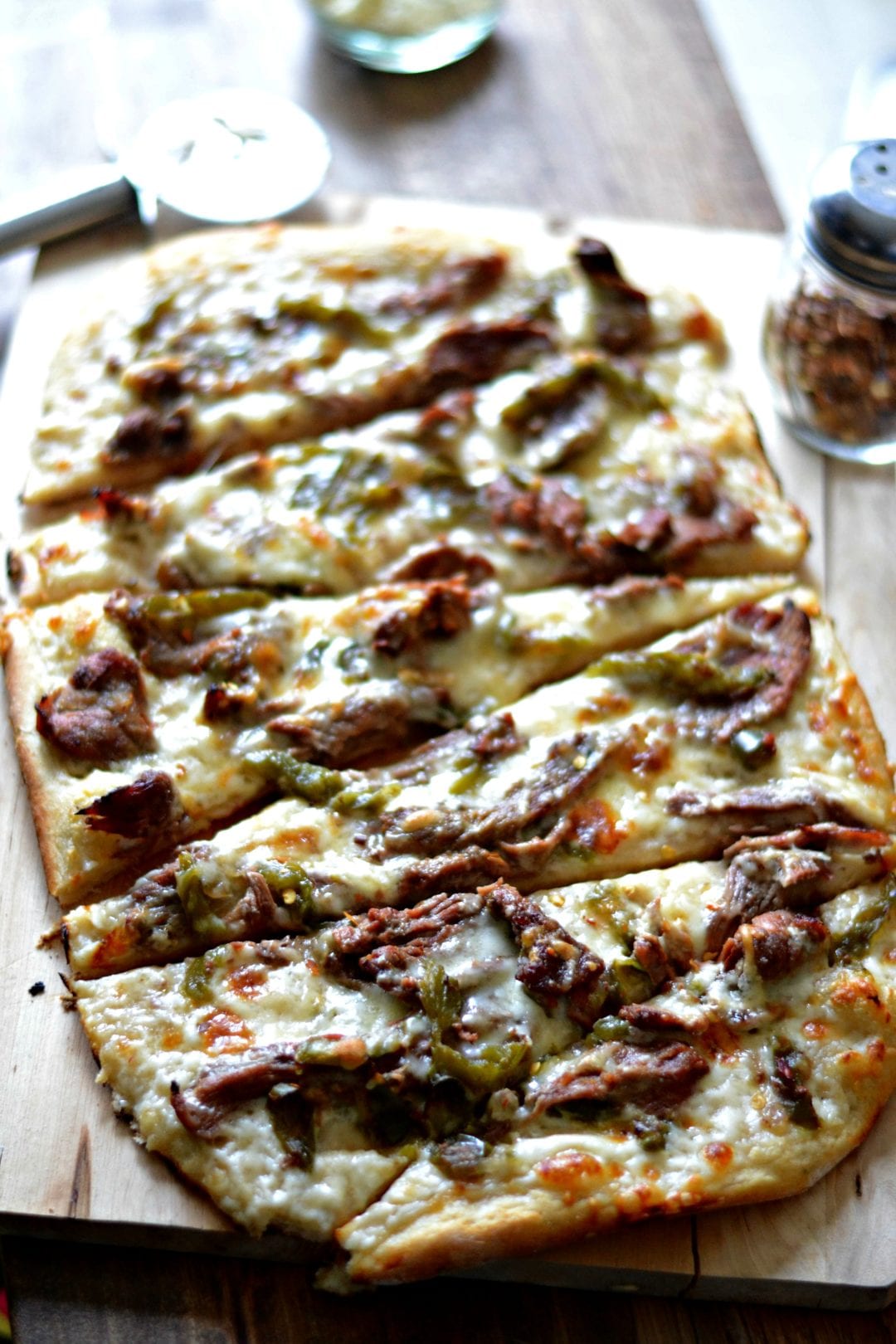 I used my classic go to pizza dough recipe. If you have a KitchenAid stand mixer, pop the hook attachment on and let it do the kneading. Or be fast and smart and buy premade dough. This cheese sauce is everything!!! It is a little thinner and would even be great on top of the meat in a hoagie bun. Or, use it for both recipes. Leftovers are the best!
