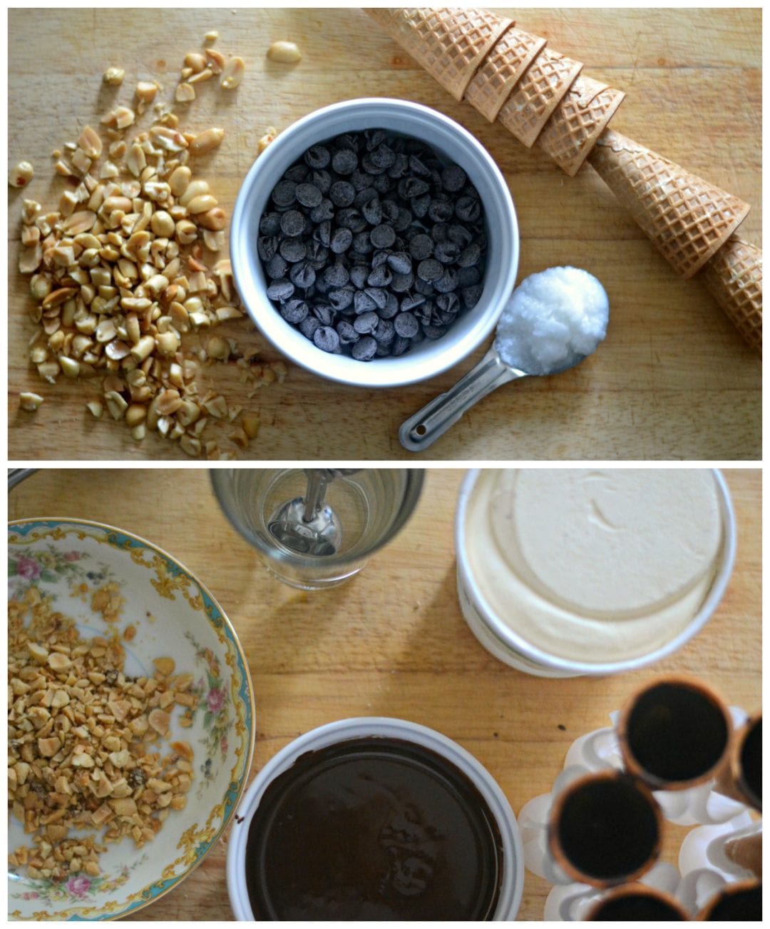 Add the chopped nuts to a small dish. Place the chocolate sauce bowl next to the nuts. Take one cone out of the freezer at a time. Tilt the chocolate sauce bowl to the side and turn the ice cream scoop in the sauce until fully coated. Hold the cone over the bowl for a few seconds to allow excess to drip off. Gently press the still soft chocolate covered cone into the nuts, turning one or two times. Place the cone back in the freezer to set up. Continue that process until all the cones are topped with chocolate and nuts.