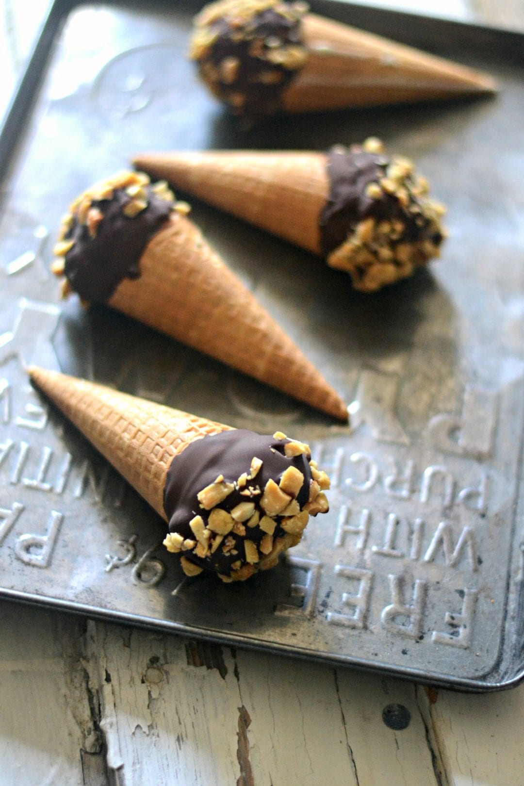 June 3, 2015 at 5:42 pmI remember the ice cream truck days. I would hear the music, run in side, beg for money (or dig in between the couch cushions) then run back outside screaming stoooopppp. My choice would vary but I had a soft spot for snow cones and not good ones, the ones that were all ice with sugar syrup already drizzled inside. KInd of a ripoff when you think about it now. The drumstick though, this is a worthy ice cream truck treat. You’ve got ice cream, all the chocolate and the peanuts. This homemade version could be dangerous.