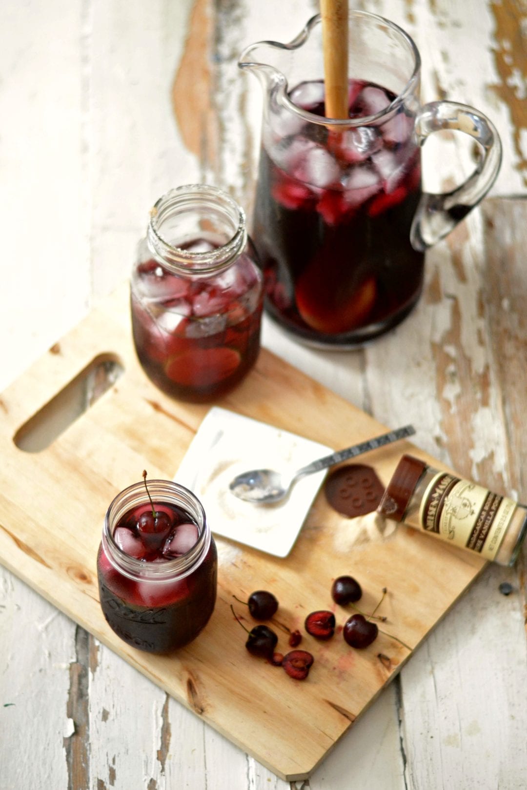 Before serving add some ice to the pitcher to keep the sangria cold. Garnish each glass with more whole cherries and pitted cherries.