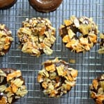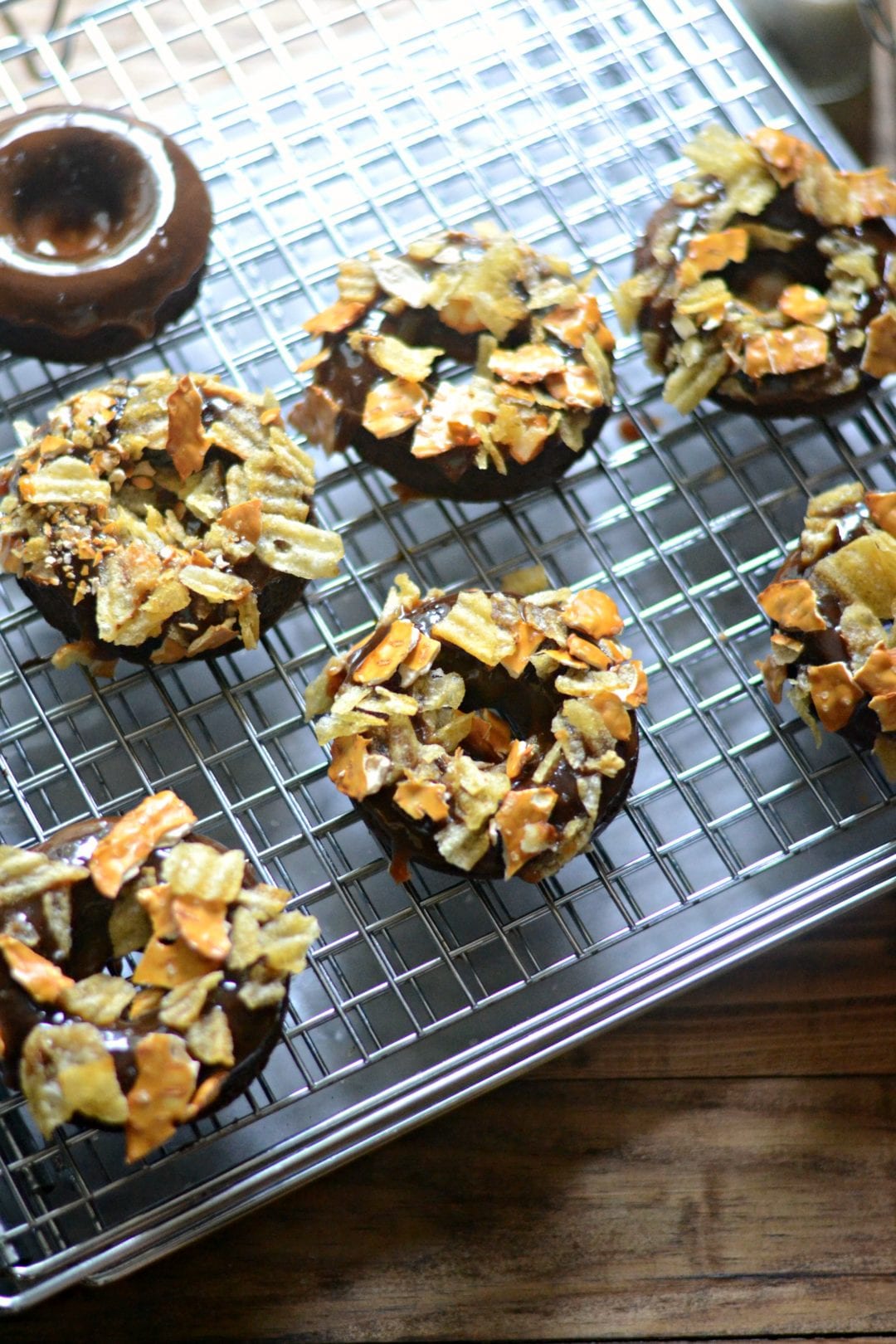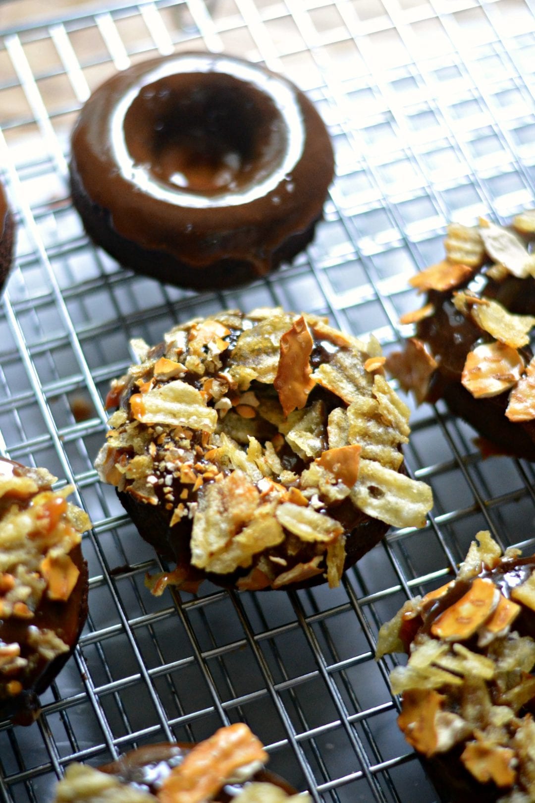 I took all my love for sweet and salty snacks and put them in/on a doughnut. Chocolate cake doughnuts covered in sticky salted caramel. The sticky caramel is perfect to grab all the crunched up pretzels and potato chips. Then (because who doesn’t need an extra dose of salt?) I topped it off with a little sprinkle of my friend Susan’s homemade Vanilla Sea Salt.
