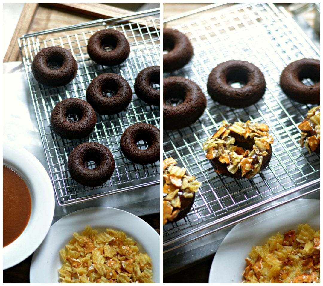 To assemble the doughnuts, first dip the doughnut into the caramel sauce. Then make sure to let the excess drip off over the caramel bowl before dipping it into the bowl with the crushed chips and pretzels. Add back to the wire rack to completely set up.