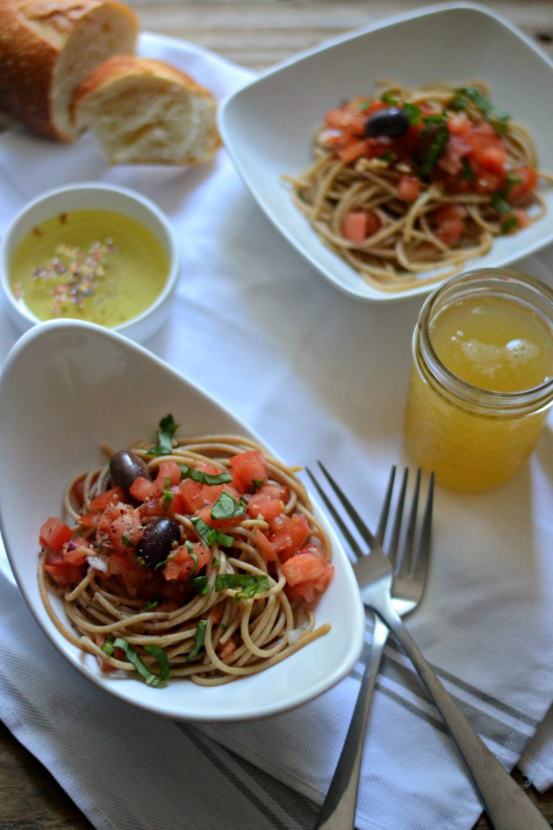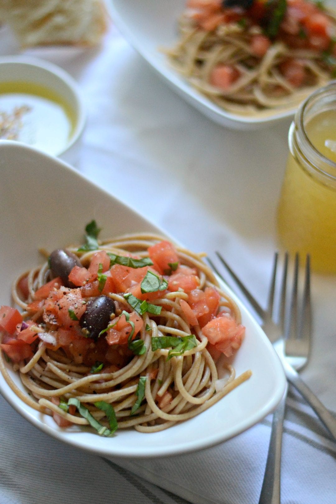 You know I am the one eating all these leftover tomatoes because Mike will have one piece of bruschetta just to appease me. So, I got crafty and repurposed those bruschetta ingredients into a super quick and fresh summer pasta dish.