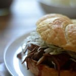 Set your slow cooker to low for 10-12 hours. I find it best to do it overnight for the next day’s dinner. Once the pork is cooked through, remove the bone and use a pair of tongs to break apart the meat into small chunks for sandwiches.