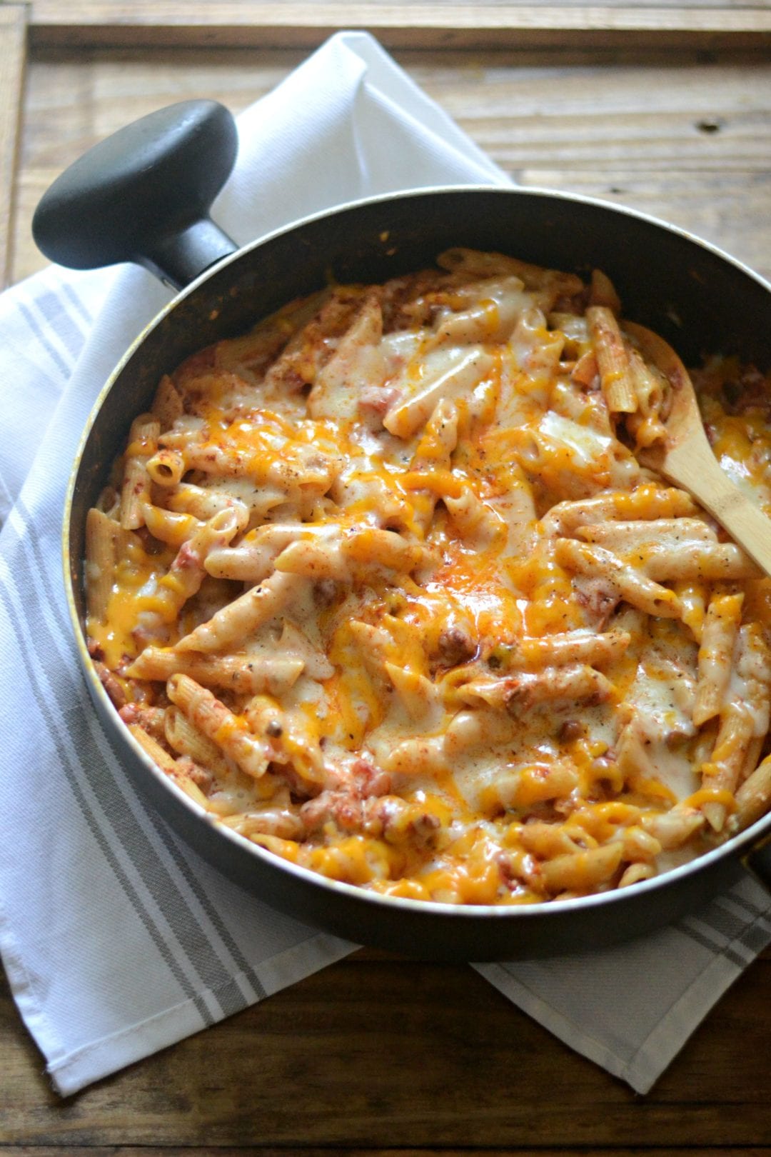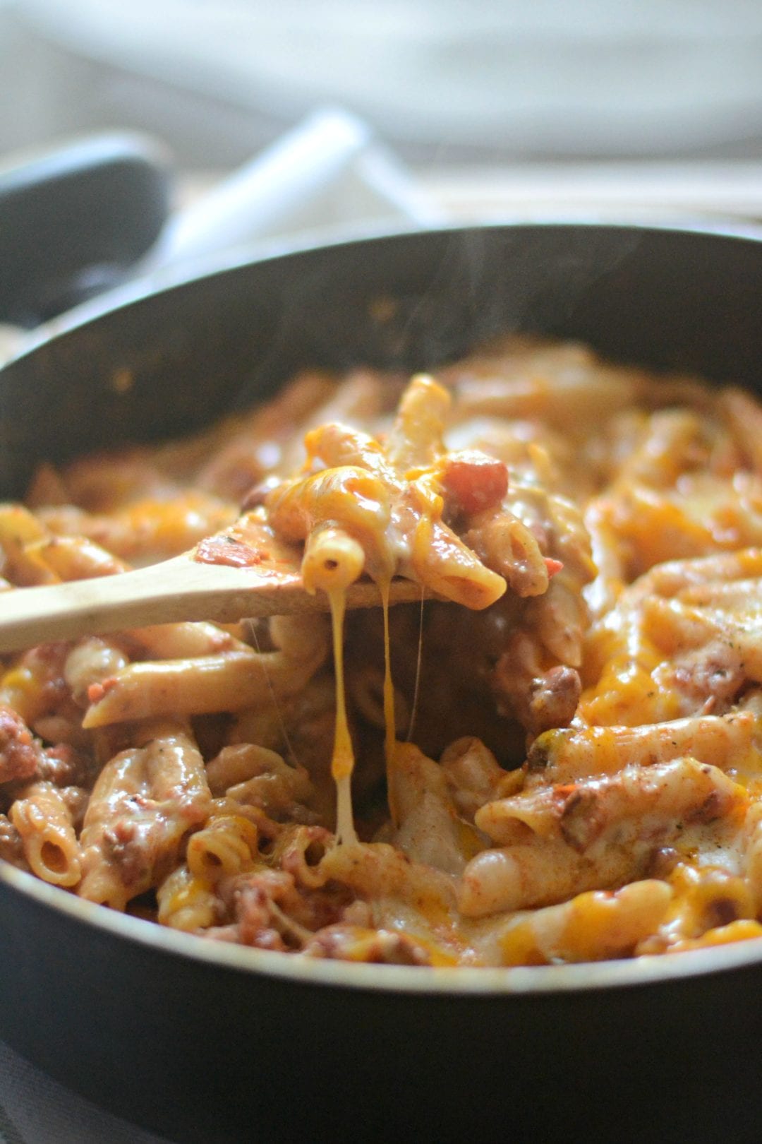 I took my love of that classic and super easy chili cheese dip and translated it into this no fuss one pot pasta dish.