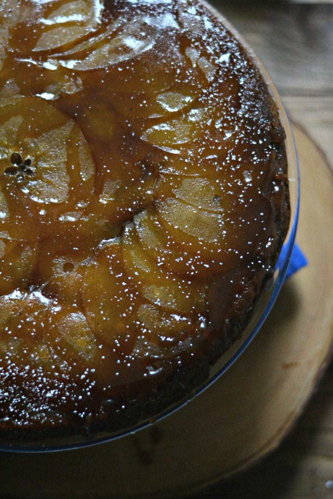Bake the cake for 45 minutes, until a toothpick inserted in the center comes out clean. Cool in the skillet for five minutes. Run a butter knife along the edges to gently loosen the cake. Invert on to a serving dish. Top with remaining sauce and let cool slightly before slicing and serving.