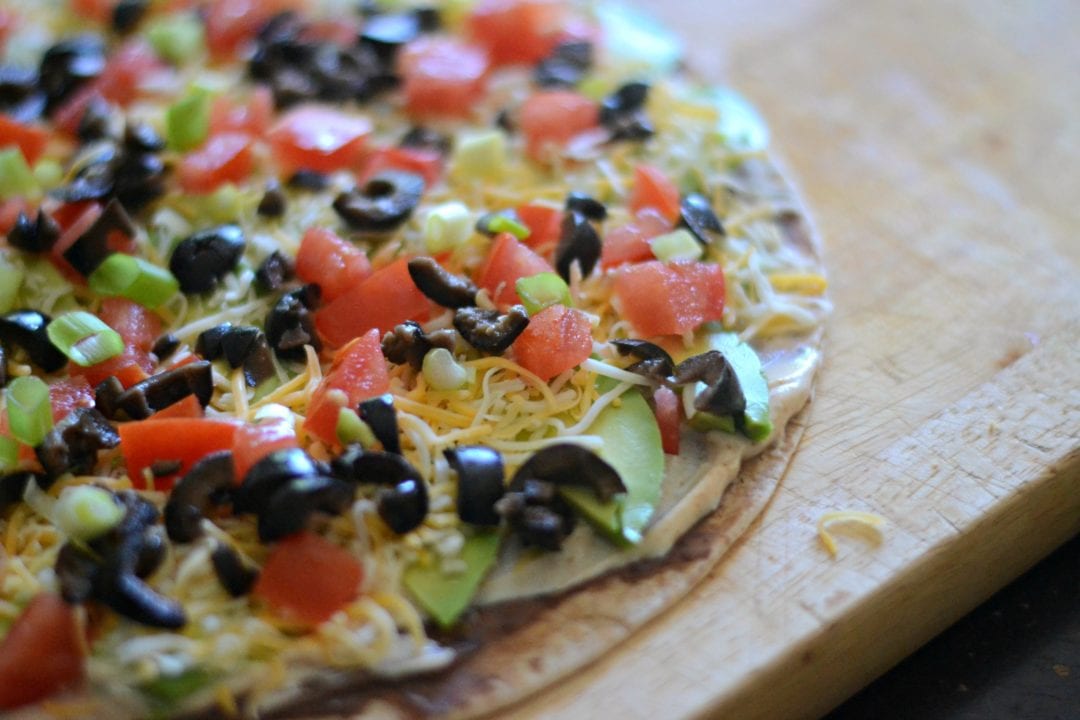 Use a rubber spatula or offset spatula to spread the black beans all over the tortilla.