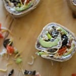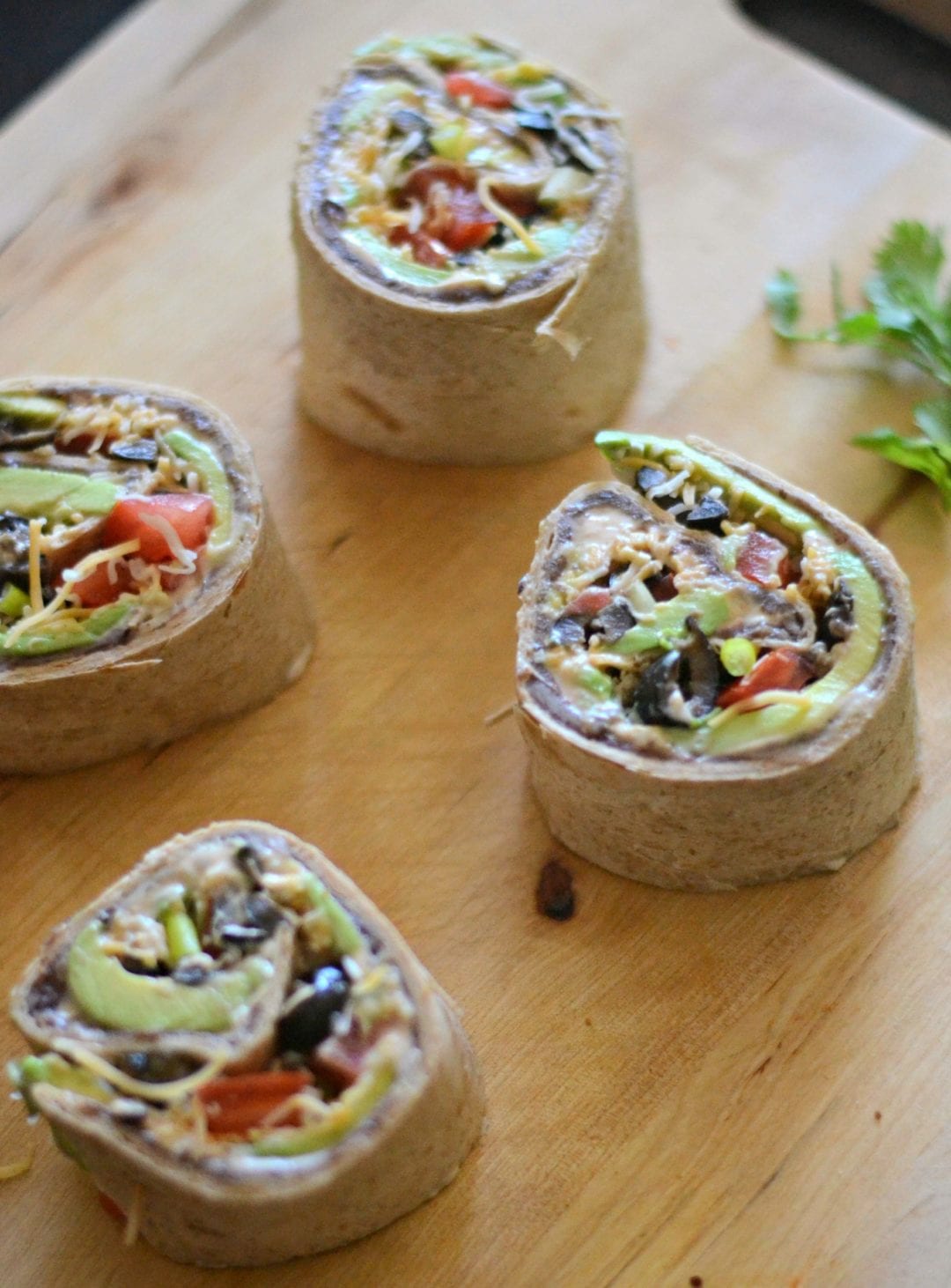 Gently roll one end of the tortilla over and roll it all the way until the other edge is underneath. Gently press down to seal the roll. Flip the roll seam side up and secure 4-6 toothpicks along the edge about an inch and a half apart. Use a serrated knife to gently slice the roll between each toothpick. Discard the edges or eat them yourself as a snack.