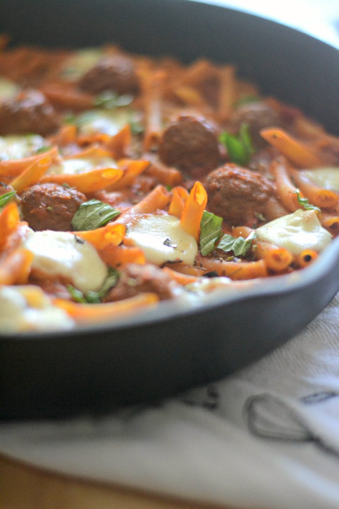 Once the pasta is tender, add the mozzarella balls to the top. Remove from heat. At this point you can either cover the pot and let the cheese melt from the residual heat or you can pop it under a high broiler in the oven for 7 minutes until the cheese gets caramelized and slightly golden.