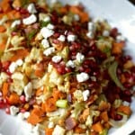 Now to assemble the salad. Add the sweet potatoes and leeks to the bowl with the fennel. Give it a good stir to make sure the vinaigrette coats all the ingredients. Transfer the mixture to a serving platter. Top with the bacon, breadcrumbs, pomegranate arils, and goat cheese if using.