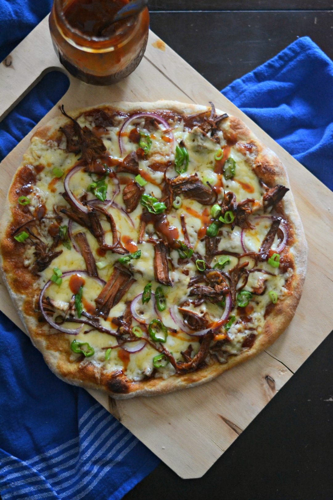 But, for those of you staying indoors this weekend and living my dream of homebody-hood, there is this pizza to keep you, your unshowered, and sweatpants wearing self company. Listen to this lazy day I have planned for you. Put some BBQ pulled pork in the slow cooker before you go to bed Friday night. That way you can have BBQ pulled pork sandwiches for lunch. Then, use the leftover pork on this pizza. Make your dough from scratch or buy store bought and be even lazier. No judgments.