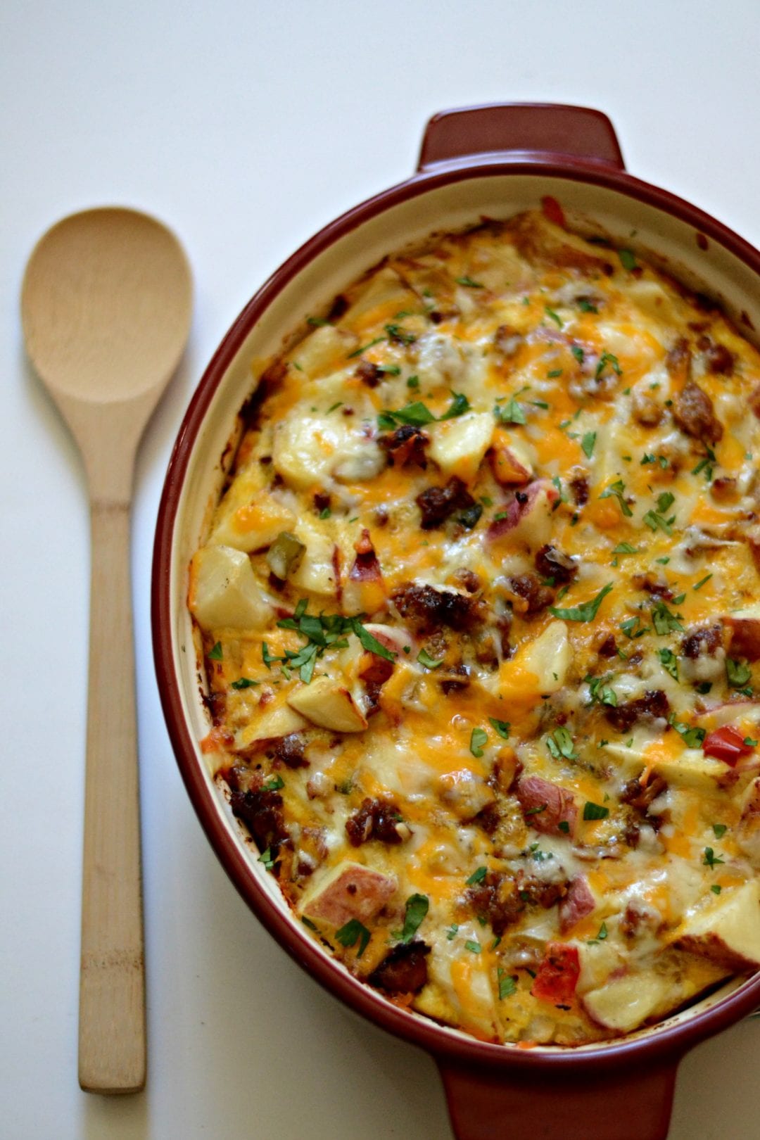 About this casserole. You can totally skip the DIY breakfast sausage and just use ground spicy Italian sausage or whatever breakfast sausage you like, cut in small pieces. This is easily prepped the night before and can even be frozen, thawed, and then baked when needed.