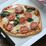 I just made a simple Margherita pizza to show you the awesomeness of this crust. It’s just a little bit of jarred tomato sauce, fresh mozz, shredded mozz, and fresh tomatoes and basil. Boom! Perfection!