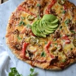 Let the pizza cool slightly before slicing. While the pizza cools, top with cilantro and sliced avocado.