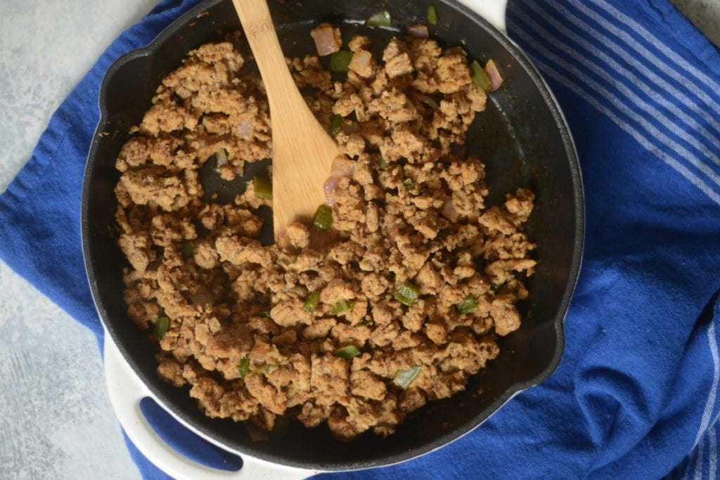 Add chicken and dry seasonings along with plenty of salt and fresh cracked black pepper to skillet. Use a wooden spoon/spatula to break the ground chicken into small bits as it cooks. Cook for about 10 minutes until golden.