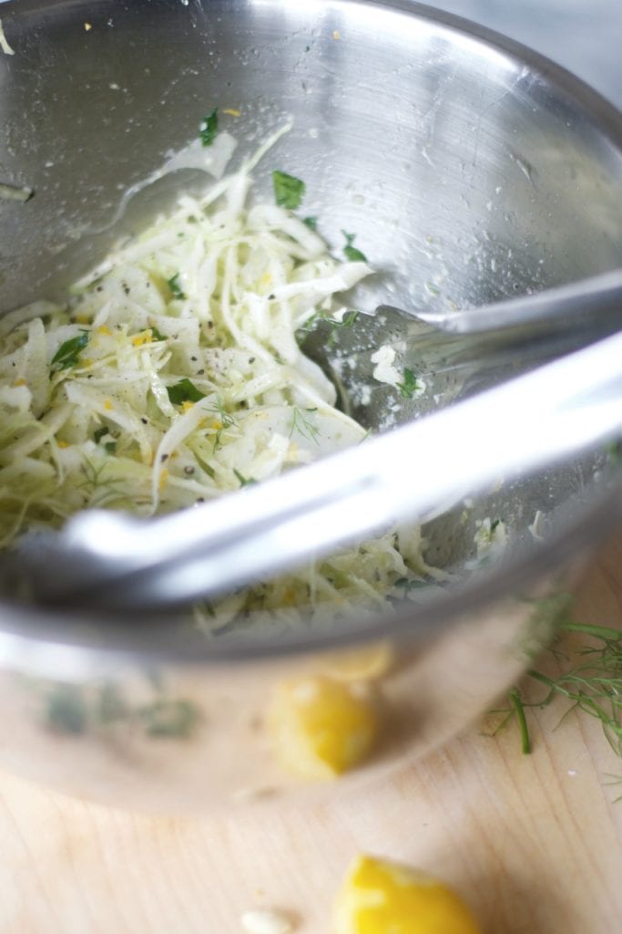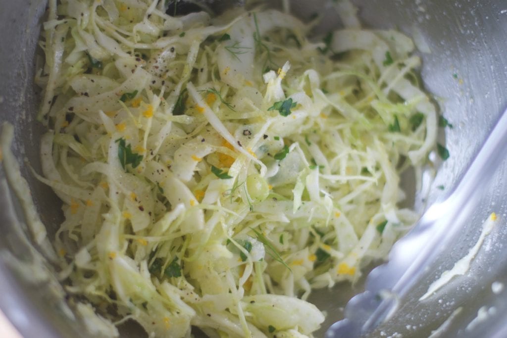 In a medium/small mixing bowl, combine the olive oil and lemon juice. Add in the cabbage and fennel along with a few bits of torn off frond.