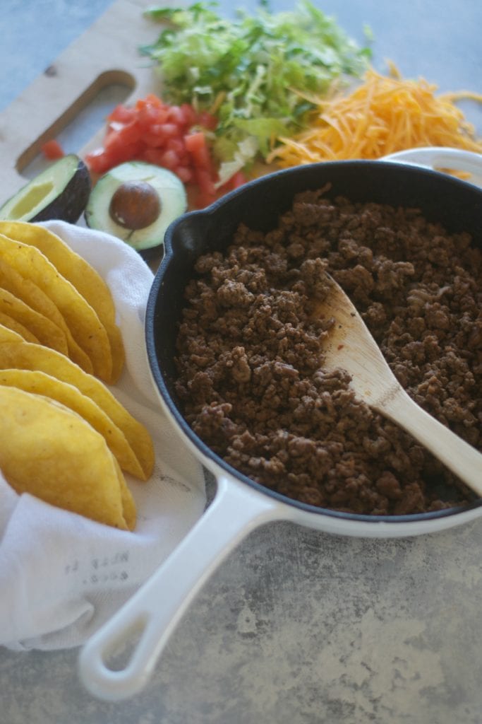 Heat olive oil in a large skillet for 1 minute over high heat. Once shimmering, add the beef and all the seasonings. Use a wooden spoon to break apart the meat and combine all the spices. Cook until golden brown, about 10-12 minutes. Leave on low while you prepare the toppings and heat/fry the shells.