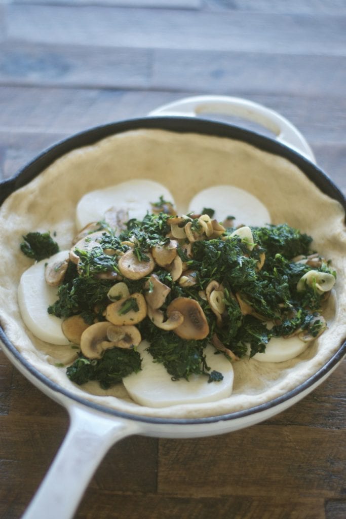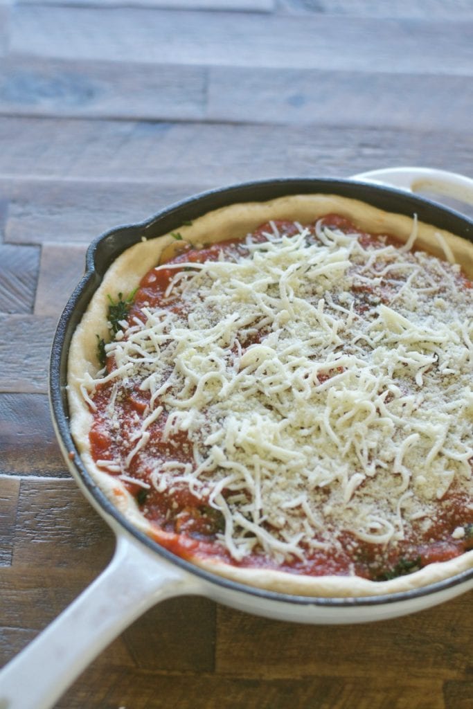 Gently place the dough into a 9 or 12 inch cast iron skillet that has been rubbed with olive oil. Press the dough into all the edges of the pan and about 3/4 of the way up the side of the pan.