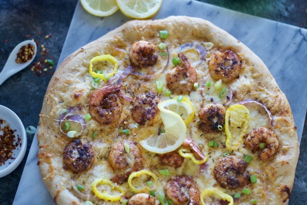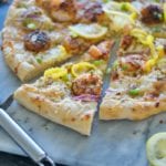 Once baked, remove from oven, and top with crushed red pepper flakes and green onion. Let cool for a minute or two before slicing. Squeeze a little bit of lemon juice over the whole pizza before serving.
