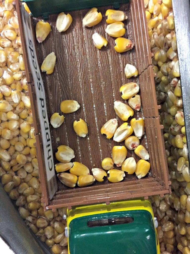 The first half of our tour of Monsanto was about plant breeding (or hybridization if you wanna get fancy with it). Some amazing fruits and vegetables have come from this process of screening plants for desired traits and cross-breeding them with other mates that share the desired traits as well. A good example of a product of this process is seedless watermelon. Seeds can be screened (no monkeying around with DNA) through the process of “chipping.” Chipping allows seed producers to save major time by chipping off a piece of a seed without damaging the seed and allowing it to still grow. Then they test each seed to determine which genes it carries and if this seed will specifically grow the kinds of viable crops (drought tolerance, more kernels, multicolored kernels, etc.) the farmers want. Think about it; an ear of corn usually has more than 600 kernels, and each kernel has its own genetic makeup and produces a unique plant which may or may not express the desired characteristics. Simply put, chipping safely reduces waste and increases yield. Right now, this technology (not a genetic modification) is being used on corn, soy, wheat, and cotton seeds.