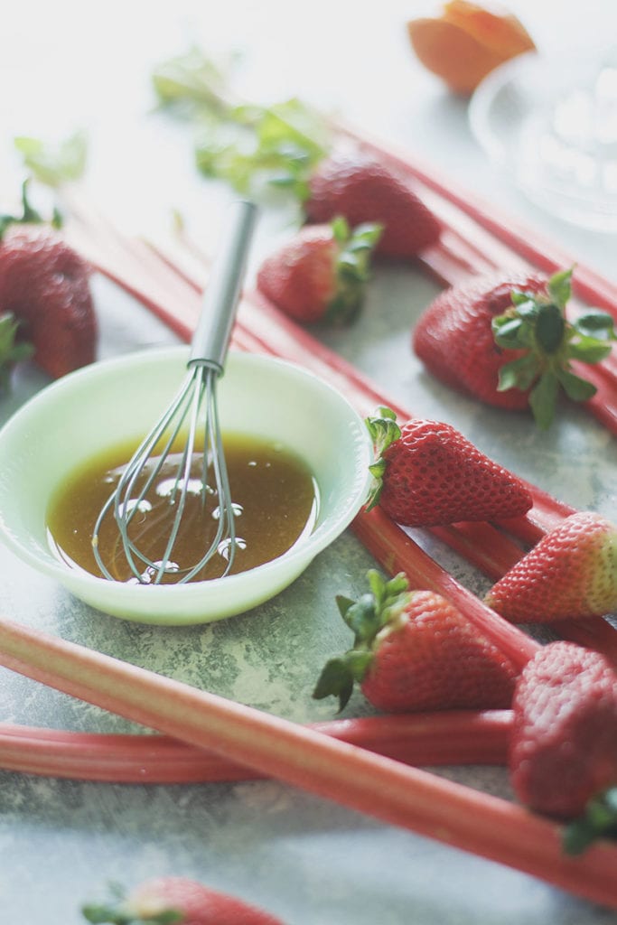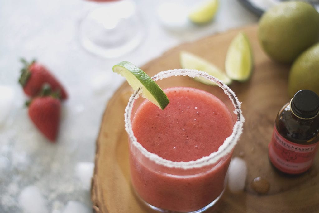 Fresh strawberries and rhubarb are roasted in orange juice and maple syrup. Then blended with ice and tequila. The addition of rose water from Nielsen-Massey brings the whole drink to the next level.