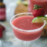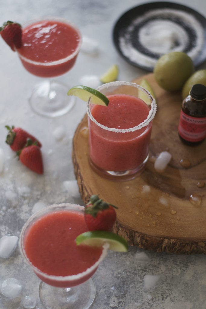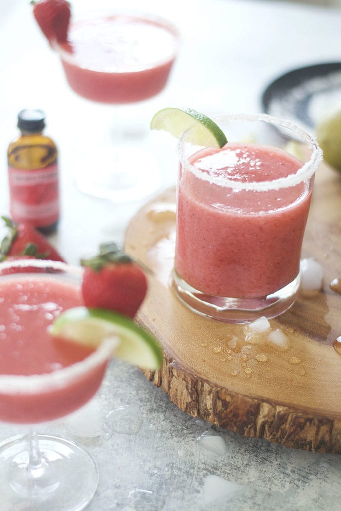 Serve in glasses rimmed with salt with a lime slice and strawberry for garnish.