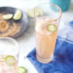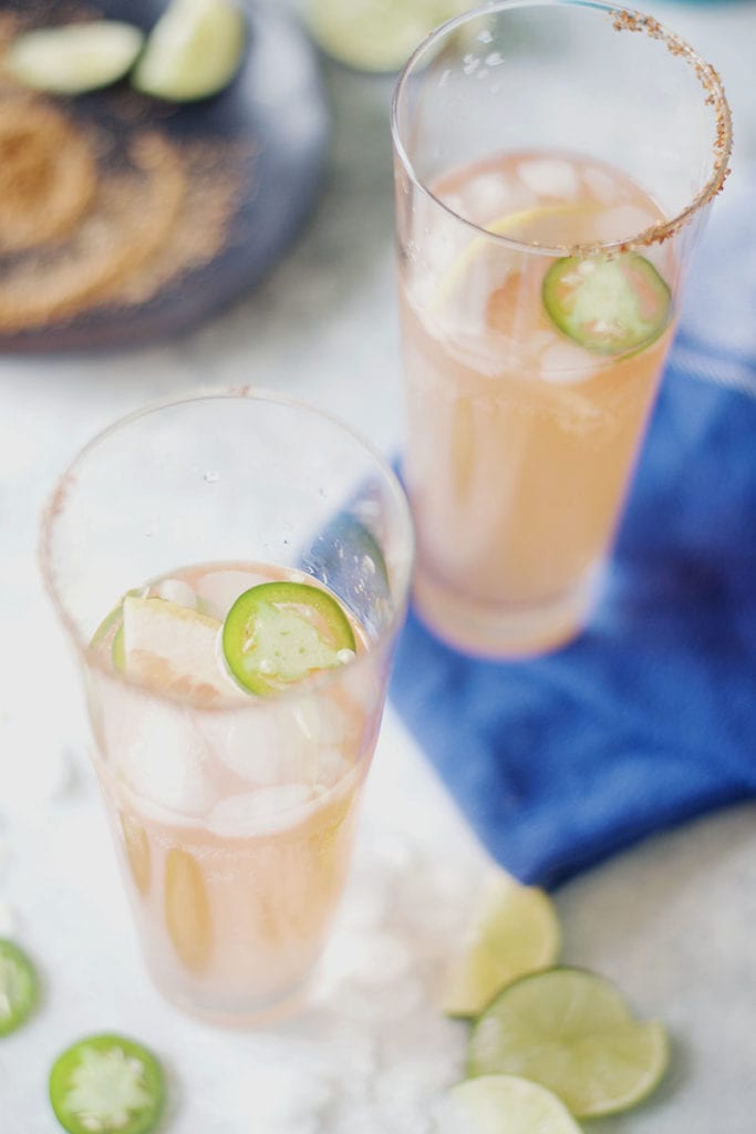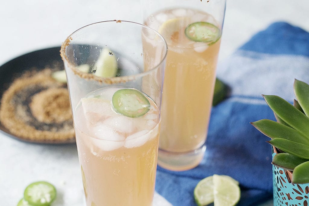 Place 1-2 slices of jalapeño to each glass, depending on your spice tolerance. Lightly muddle the jalapeño. Do not break it apart, just press it to release the oils into the tequila.