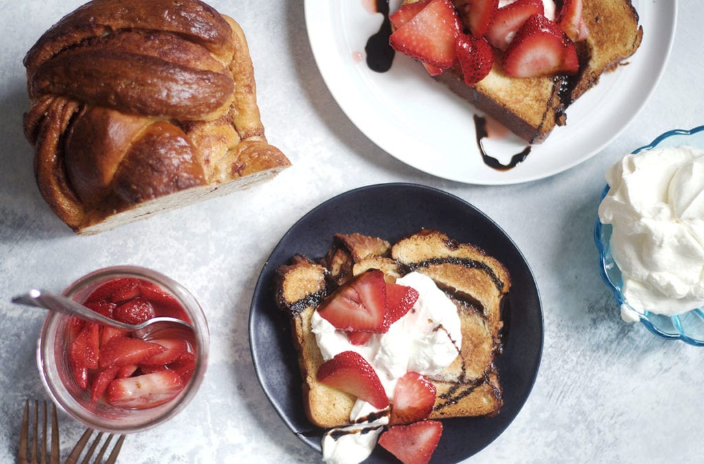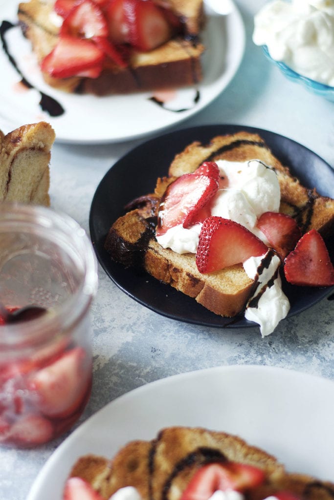 Toast your slices of babka. Add the whipped cream to the toast. Top with macerated strawberries and some of the liquid. Drizzle with balsamic syrup if using. Serve right away.