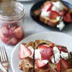I used strawberries macerated in orange bitters, lemon juice, and sugar. After an hour they are good for topping sweet toasts like this or even ice cream or yogurt. Give it a try, but keep it down.