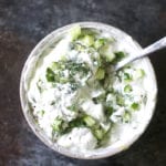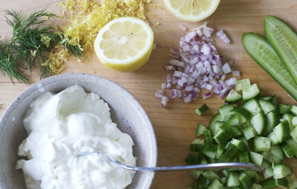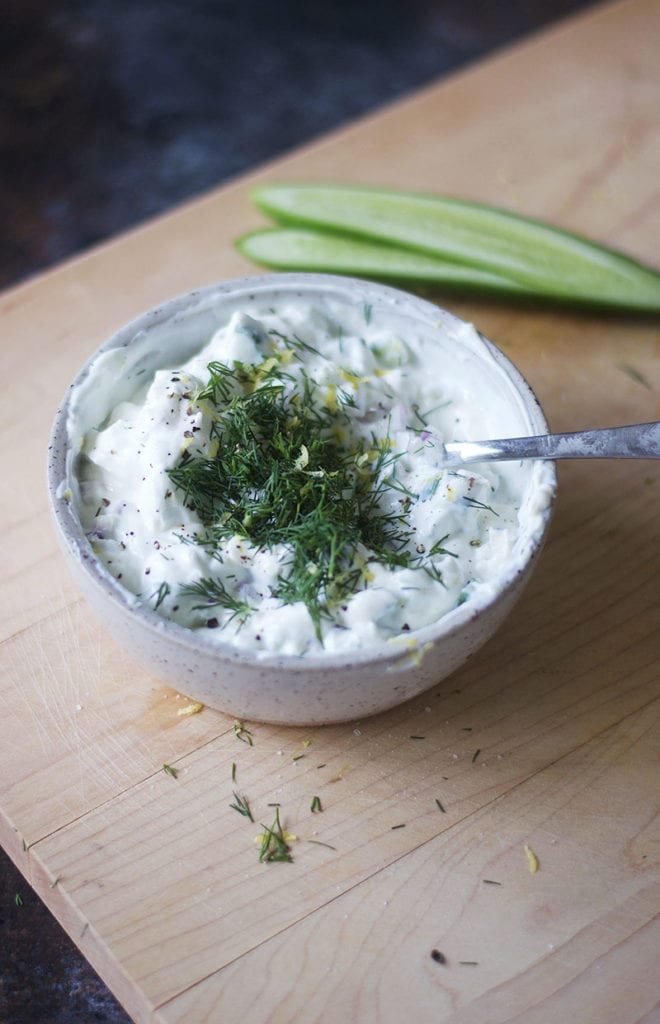 It is practically cucumber and tomato season! I cannot wait for all things tomato and cucumber. Get ready for an onslaught. If you saw that Greek grilled skirt steak from the other day, you were probably wondering what is that beautiful looking sauce on top of the steak? Well that, my friends, is my favorite summer sauce, tzatziki. Yeah, there are a million recipes for this all over the web. But this is the one I usually make. It is quick, light, easy, and by no means traditional.
