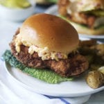 Spread a few tablespoons of pimento cheese on the inside of the top bun. Place a lettuce leaf on the bottom bun. Place the fried chicken on top of the lettuce and top it with pickles slices and then the top bun.